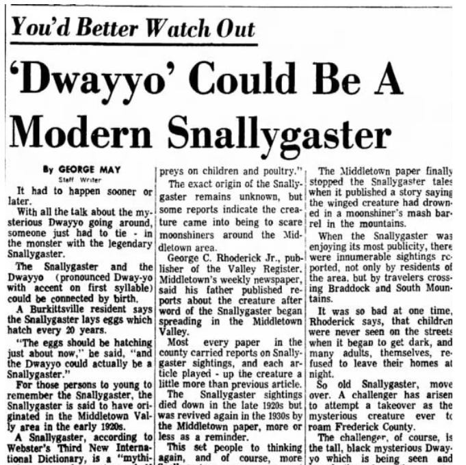 But in 1965, the monster attacks returned to Frederick County’s cursed mountains. “It had to happen sooner or later,” News-Post reporter George May wrote on Nov. 27, 1965, under a headline, “You’d Better Watch Out: Dwayyo Could Be A Modern Snallygaster.”