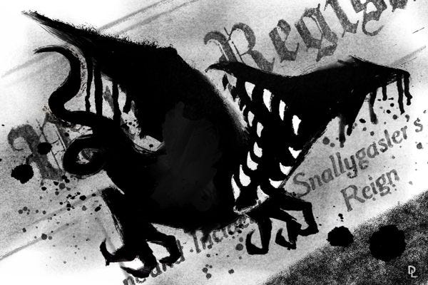 As the German language mixed with English and other Colonial dialects in the mid-Appalachian ranges, the monster’s name became pronounced and spelled as “snallygaster.”